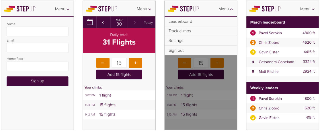 Step Up was the result of a 3-day hackathon project that I worked on with a developer from my team. Our office had a competition going to see who could log the most flights of stairs in a month. The competition started with a few of us logging our stair climbs on a whiteboard, and eventually gained popularity and evolved to a google doc. The goal for this hackathon was to build a simple web app that would make it easier to log and track your progress throughout the month.